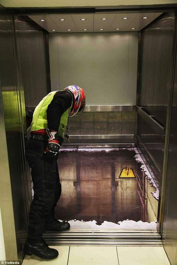 Представьте себя в крупном торговом центре, когда вы подходите с покупками к лифту, его двери открываются, вы заносите ногу, чтобы войти внутрь и тут вы обнаруживаете, что у лифта нет пола. Немного шокирующе, не правда ли? Но именно такую 3D-иллюзию и создал художник Эндрю Уолкер в одном из лифтов торгового центра Southside в Лондоне.