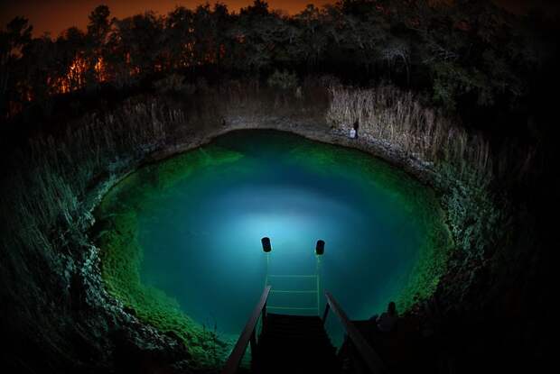 Изумрудно-зеленые воды грота «сорока саженей» во Флориде. Для подсветки в ночное время использовались подводные светодиодные фонари: